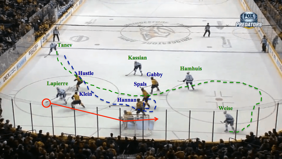 The Canucks are breaking into the zone, and the Preds’ positioning could not look beautiful. They’re perfectly set up. They’ve boxed Hamhuis in, which will force him to make a decision with the puck, Spals has the far-side winger covered, and Hustle and Gabby are ready to pick their covers once Hamhuis makes his move.