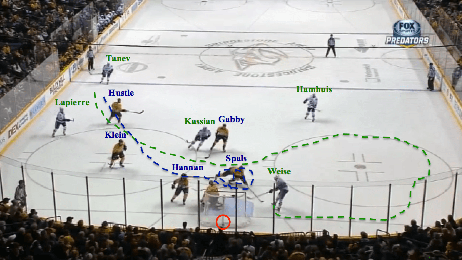 Assumption 2: Hannan leaves Hamhuis, who is heading back to the blue line, and heads to the front of the net to cover for Klein. Hamhuis is certainly still a possible threat, however, and therefore I understand why Gabby decides to cover him; not only is he open, but he’s also the guy Gabby would normally be in charge of covering anyway. The other reason Gabby goes after Hamhuis is that he doesn’t know about Weise, who has snuck down behind him.
